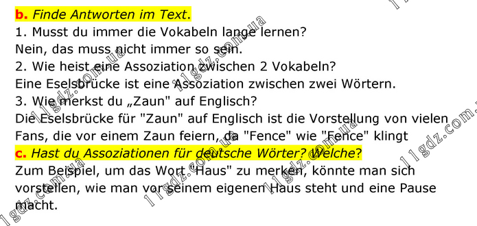 b. Finde Antworten im Text. 1. Musst du immer die Vokabeln lange lernen? Nein, das muss nicht immer so sein. 2. Wie heist eine Assoziation zwischen 2 Vokabeln? Eine Eselsbrücke ist eine Assoziation zwischen zwei Wörtern. 3. Wie merkst du „Zaun" auf Englisch? Die Eselsbrücke für "Zaun" auf Englisch ist die Vorstellung von vielen Fans, die vor einem Zaun feiern, da "Fence" wie "Fence" klingt c. Hast du Assoziationen für deutsche Wörter? Welche? Zum Beispiel, um das Wort "Haus" zu merken, könnte man sich vorstellen, wie man vor seinem eigenen Haus steht und eine Pause macht.