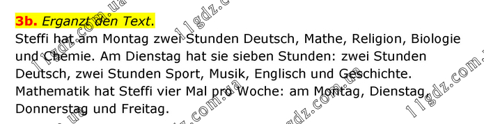 Erganzt den Text. Steffi hat am Montag zwei Stunden Deutsch, Mathe, Religion, Biologie und Chemie. Am Dienstag hat sie sieben Stunden: zwei Stunden Deutsch, zwei Stunden Sport, Musik, Englisch und Geschichte. Mathematik hat Steffi vier Mal pro Woche: am Montag, Dienstag, Donnerstag und Freitag.