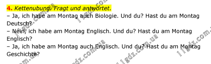 Kettenubung. Fragt und antwortet. – Ja, ich habe am Montag auch Biologie. Und du? Hast du am Montag Deutsch? – Nein, ich habe am Montag Englisch. Und du? Hast du am Montag Englisch? – Ja, ich habe am Montag auch Englisch. Und du? Hast du am Montag Geschichte?