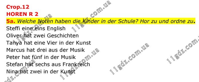 HOREN R 2 5a. Welche Noten haben die Kinder in der Schule? Hor zu und ordne zu. Steffi eine eins English Oliver hat zwei Geschichten Tanya hat eine Vier in der Kunst Marcus hat drei aus der Musik Peter hat fünf in der Musik Stefan hat sechs aus Frankreich Nina hat zwei in der Kunst