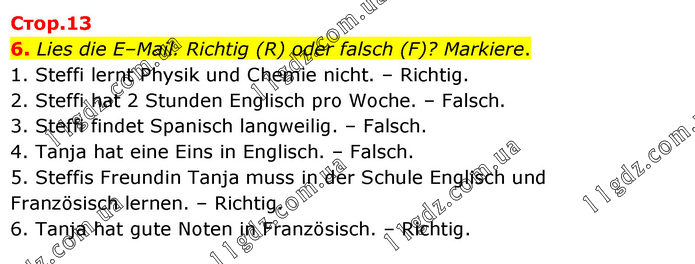 Lies die E–Mail. Richtig (R) oder falsch (F)? Markiere. 1. Steffi lernt Physik und Chemie nicht. – Richtig. 2. Steffi hat 2 Stunden Englisch pro Woche. – Falsch. 3. Steffi findet Spanisch langweilig. – Falsch. 4. Tanja hat eine Eins in Englisch. – Falsch. 5. Steffis Freundin Tanja muss in der Schule Englisch und Französisch lernen. – Richtig. 6. Tanja hat gute Noten in Französisch. – Richtig.
