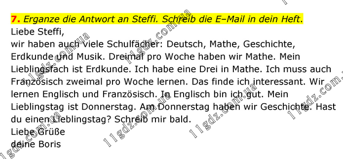 Erganze die Antwort an Steffi. Schreib die E–Mail in dein Heft. Liebe Steffi, wir haben auch viele Schulfächer: Deutsch, Mathe, Geschichte, Erdkunde und Musik. Dreimal pro Woche haben wir Mathe. Mein Lieblingsfach ist Erdkunde. Ich habe eine Drei in Mathe. Ich muss auch Französisch zweimal pro Woche lernen. Das finde ich interessant. Wir lernen Englisch und Französisch. In Englisch bin ich gut. Mein Lieblingstag ist Donnerstag. Am Donnerstag haben wir Geschichte. Hast du einen Lieblingstag? Schreib mir bald. Liebe Grüße deine Boris