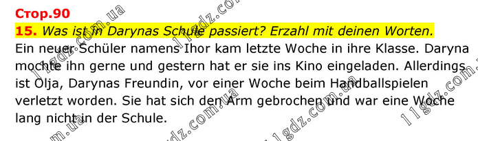 Was ist in Darynas Schule passiert? Erzahl mit deinen Worten. Ein neuer Schüler namens Ihor kam letzte Woche in ihre Klasse. Daryna mochte ihn gerne und gestern hat er sie ins Kino eingeladen. Allerdings ist Olja, Darynas Freundin, vor einer Woche beim Handballspielen verletzt worden. Sie hat sich den Arm gebrochen und war eine Woche lang nicht in der Schule.