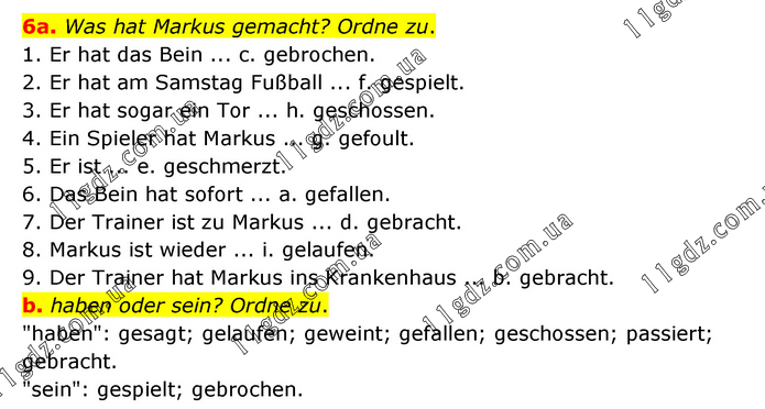 a. Was hat Markus gemacht? Ordne zu. 1. Er hat das Bein ... c. gebrochen. 2. Er hat am Samstag Fußball ... f. gespielt. 3. Er hat sogar ein Tor ... h. geschossen. 4. Ein Spieler hat Markus ... g. gefoult. 5. Er ist ... e. geschmerzt. 6. Das Bein hat sofort ... a. gefallen. 7. Der Trainer ist zu Markus ... d. gebracht. 8. Markus ist wieder ... i. gelaufen. 9. Der Trainer hat Markus ins Krankenhaus ... b. gebracht. b. haben oder sein? Ordne zu. "haben": gesagt; gelaufen; geweint; gefallen; geschossen; passiert; gebracht. "sein": gespielt; gebrochen.
