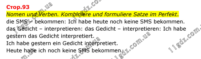 Nomen und Verben. Kombiniere und formuliere Satze im Perfekt. die SMS – bekommen: Ich habe heute noch keine SMS bekommen. das Gedicht – interpretieren: das Gedicht – interpretieren: Ich habe gestern das Gedicht interpretiert. Ich habe gestern ein Gedicht interpretiert. Heute habe ich noch keine SMS bekommen.