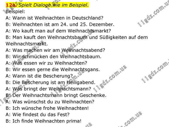 Spielt Dialoge wie im Beispiel. Beispiel: A: Wann ist Weihnachten in Deutschland? B: Weihnachten ist am 24. und 25. Dezember. A: Wo kauft man auf dem Weihnachtsmarkt? B: Man kauft den Weihnachtsbaum und Süßigkeiten auf dem Weihnachtsmarkt. A: Was machen wir am Weihnachtsabend? B: Wir schmücken den Weihnachtsbaum. A: Was essen wir zu Weihnachten? B: Wir essen gerne die Weihnachtsgans. A: Wann ist die Bescherung? B: Die Bescherung ist am Heiligabend. A: Was bringt der Weihnachtsmann? B: Der Weihnachtsmann bringt Geschenke. A: Was wünschst du zu Weihnachten? B: Ich wünsche frohe Weihnachten! A: Wie findest du das Fest? B: Ich finde Weihnachten prima!