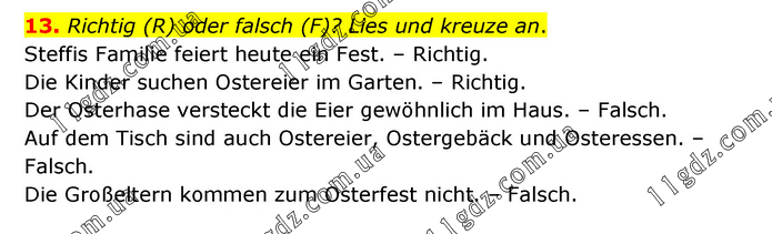 Richtig (R) oder falsch (F)? Lies und kreuze an. Steffis Familie feiert heute ein Fest. – Richtig. Die Kinder suchen Ostereier im Garten. – Richtig. Der Osterhase versteckt die Eier gewöhnlich im Haus. – Falsch. Auf dem Tisch sind auch Ostereier, Ostergebäck und Osteressen. – Falsch. Die Großeltern kommen zum Osterfest nicht. – Falsch.