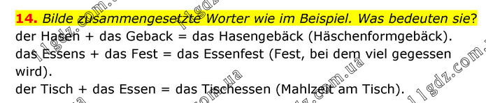 Bilde zusammengesetzte Worter wie im Beispiel. Was bedeuten sie? der Hasen + das Geback = das Hasengebäck (Häschenformgebäck). das Essens + das Fest = das Essenfest (Fest, bei dem viel gegessen wird). der Tisch + das Essen = das Tischessen (Mahlzeit am Tisch).