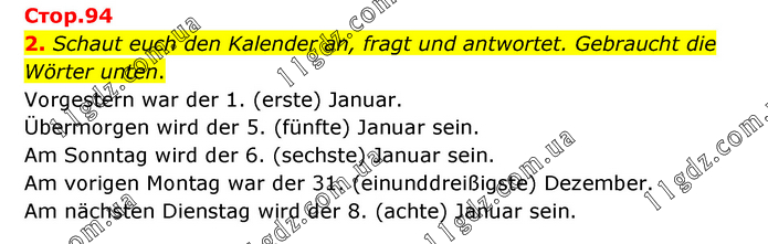 Schaut euch den Kalender an, fragt und antwortet. Gebraucht die Wörter unten. Vorgestern war der 1. (erste) Januar. Übermorgen wird der 5. (fünfte) Januar sein. Am Sonntag wird der 6. (sechste) Januar sein. Am vorigen Montag war der 31. (einunddreißigste) Dezember. Am nächsten Dienstag wird der 8. (achte) Januar sein.
