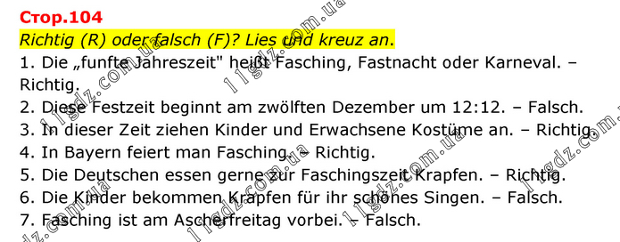 Richtig (R) oder falsch (F)? Lies und kreuz an. 1. Die „funfte Jahreszeit" heißt Fasching, Fastnacht oder Karneval. – Richtig. 2. Diese Festzeit beginnt am zwölften Dezember um 12:12. – Falsch. 3. In dieser Zeit ziehen Kinder und Erwachsene Kostüme an. – Richtig. 4. In Bayern feiert man Fasching. – Richtig. 5. Die Deutschen essen gerne zur Faschingszeit Krapfen. – Richtig. 6. Die Kinder bekommen Krapfen für ihr schönes Singen. – Falsch. 7. Fasching ist am Ascherfreitag vorbei. – Falsch.