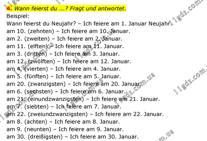 Wann feierst du ...? Fragt und antwortet. Beispiel: Wann feierst du Neujahr? – Ich feiere am 1. Januar Neujahr. am 10. (zehnten) – Ich feiere am 10. Januar. am 2. (zweiten) – Ich feiere am 2. Januar. am 11. (elften) – Ich feiere am 11. Januar. am 3. (dritten) – Ich feiere am 3. Januar. am 12. (zwölften) – Ich feiere am 12. Januar. am 4. (vierten) – Ich feiere am 4. Januar. am 5. (fünften) – Ich feiere am 5. Januar. am 20. (zwanzigsten) – Ich feiere am 20. Januar. am 6. (sechsten) – Ich feiere am 6. Januar. am 21. (einundzwanzigsten) – Ich feiere am 21. Januar. am 7. (siebten) – Ich feiere am 7. Januar. am 22. (zweiundzwanzigsten) – Ich feiere am 22. Januar. am 8. (achten) – Ich feiere am 8. Januar. am 9. (neunten) – Ich feiere am 9. Januar. am 30. (dreißigsten) – Ich feiere am 30. Januar.