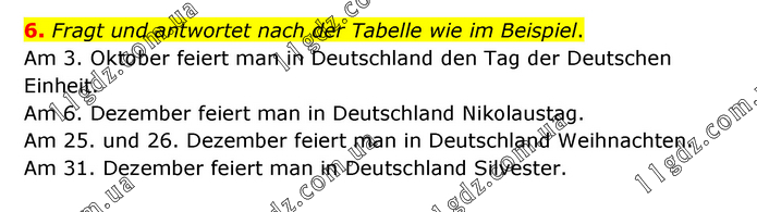 Fragt und antwortet nach der Tabelle wie im Beispiel. Am 3. Oktober feiert man in Deutschland den Tag der Deutschen Einheit. Am 6. Dezember feiert man in Deutschland Nikolaustag. Am 25. und 26. Dezember feiert man in Deutschland Weihnachten. Am 31. Dezember feiert man in Deutschland Silvester.