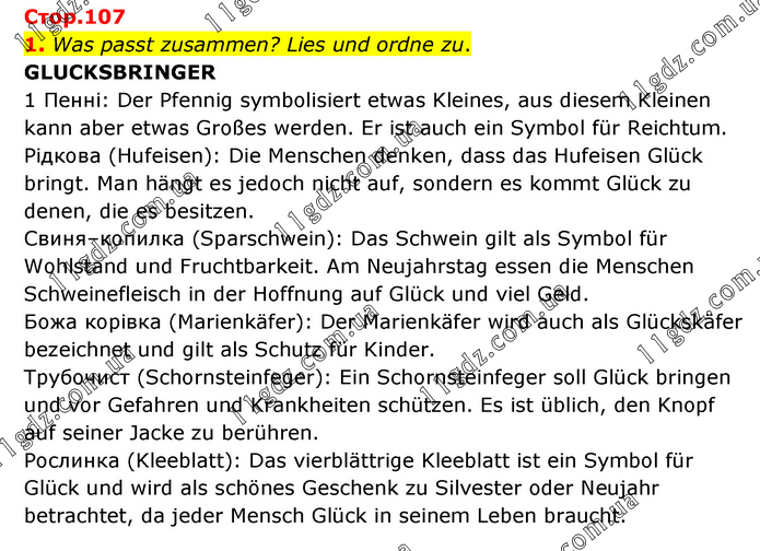 Was passt zusammen? Lies und ordne zu. GLUCKSBRINGER 1 Пеннi: Der Pfennig symbolisiert etwas Kleines, aus diesem Kleinen kann aber etwas Großes werden. Er ist auch ein Symbol für Reichtum. Pідкова (Hufeisen): Die Menschen denken, dass das Hufeisen Glück bringt. Man hängt es jedoch nicht auf, sondern es kommt Glück zu denen, die es besitzen. Свиня–копилка (Sparschwein): Das Schwein gilt als Symbol für Wohlstand und Fruchtbarkeit. Am Neujahrstag essen die Menschen Schweinefleisch in der Hoffnung auf Glück und viel Geld. Божа корівка (Marienkäfer): Der Marienkäfer wird auch als Glückskäfer bezeichnet und gilt als Schutz für Kinder. Трубочист (Schornsteinfeger): Ein Schornsteinfeger soll Glück bringen und vor Gefahren und Krankheiten schützen. Es ist üblich, den Knopf auf seiner Jacke zu berühren. Рослинка (Kleeblatt): Das vierblättrige Kleeblatt ist ein Symbol für Glück und wird als schönes Geschenk zu Silvester oder Neujahr betrachtet, da jeder Mensch Glück in seinem Leben braucht.