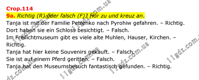 Richtig (R) oder falsch (F)? Hor zu und kreuz an. Tanja ist mit der Familie Petrenko nach Pyrohiw gefahren. – Richtig. Dort haben sie ein Schloss besichtigt. – Falsch. Im Freilichtmuseum gibt es viele alte Muhlen, Hauser, Kirchen. – Richtig. Tanja hat hier keine Souvenirs gekauft. – Falsch. Sie ist auf einem Pferd geritten. – Falsch. Tanja hat den Museumsbesuch fantastisch gefunden. – Richtig.