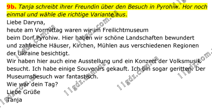 Tanja schreibt ihrer Freundin über den Besuch in Pyrohiw. Hor noch einmal und wähle die richtige Variante aus. Liebe Daryna, heute am Vormittag waren wir im Freilichtmuseum beim Dorf Pyrohiw. Hier haben wir schöne Landschaften bewundert und zahlreiche Häuser, Kirchen, Mühlen aus verschiedenen Regionen der Ukraine besichtigt. Wir haben hier auch eine Ausstellung und ein Konzert der Volksmusik besucht. Ich habe einige Souvenirs gekauft. Ich bin sogar geritten. Der Museumsbesuch war fantastisch. Wie war dein Tag? Liebe Grüße Tanja