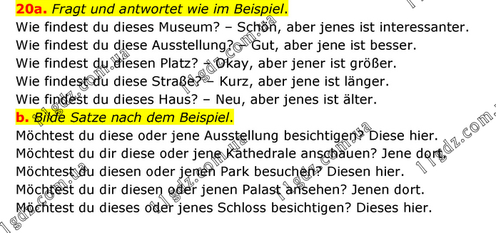 20a. Fragt und antwortet wie im Beispiel. Wie findest du dieses Museum? – Schön, aber jenes ist interessanter. Wie findest du diese Ausstellung? – Gut, aber jene ist besser. Wie findest du diesen Platz? – Okay, aber jener ist größer. Wie findest du diese Straße? – Kurz, aber jene ist länger. Wie findest du dieses Haus? – Neu, aber jenes ist älter. b. Bilde Satze nach dem Beispiel. Möchtest du diese oder jene Ausstellung besichtigen? Diese hier. Möchtest du dir diese oder jene Kathedrale anschauen? Jene dort. Möchtest du diesen oder jenen Park besuchen? Diesen hier. Möchtest du dir diesen oder jenen Palast ansehen? Jenen dort. Möchtest du dieses oder jenes Schloss besichtigen? Dieses hier.