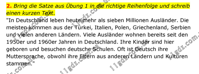 Bring die Satze aus Übung 1 in die richtige Reihenfolge und schreib einen kurzen Text. "In Deutschland leben heute mehr als sieben Millionen Ausländer. Die meisten kommen aus der Türkei, Italien, Polen, Griechenland, Serbien und vielen anderen Ländern. Viele Ausländer wohnen bereits seit den 1950er und 1960er Jahren in Deutschland. Ihre Kinder sind hier geboren und besuchen deutsche Schulen. Oft ist Deutsch ihre Muttersprache, obwohl ihre Eltern aus anderen Ländern und Kulturen stammen."
