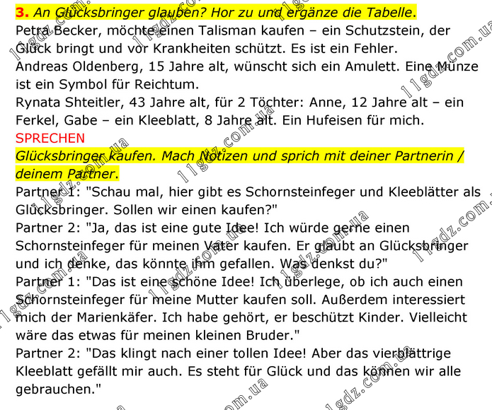 An Glücksbringer glauben? Hor zu und ergänze die Tabelle. Petra Becker, möchte einen Talisman kaufen – ein Schutzstein, der Glück bringt und vor Krankheiten schützt. Es ist ein Fehler. Andreas Oldenberg, 15 Jahre alt, wünscht sich ein Amulett. Eine Münze ist ein Symbol für Reichtum. Rynata Shteitler, 43 Jahre alt, für 2 Töchter: Anne, 12 Jahre alt – ein Ferkel, Gabe – ein Kleeblatt, 8 Jahre alt. Ein Hufeisen für mich. SPRECHEN Glücksbringer kaufen. Mach Notizen und sprich mit deiner Partnerin / deinem Partner. Partner 1: "Schau mal, hier gibt es Schornsteinfeger und Kleeblätter als Glücksbringer. Sollen wir einen kaufen?" Partner 2: "Ja, das ist eine gute Idee! Ich würde gerne einen Schornsteinfeger für meinen Vater kaufen. Er glaubt an Glücksbringer und ich denke, das könnte ihm gefallen. Was denkst du?" Partner 1: "Das ist eine schöne Idee! Ich überlege, ob ich auch einen Schornsteinfeger für meine Mutter kaufen soll. Außerdem interessiert mich der Marienkäfer. Ich habe gehört, er beschützt Kinder. Vielleicht wäre das etwas für meinen kleinen Bruder." Partner 2: "Das klingt nach einer tollen Idee! Aber das vierblättrige Kleeblatt gefällt mir auch. Es steht für Glück und das können wir alle gebrauchen."