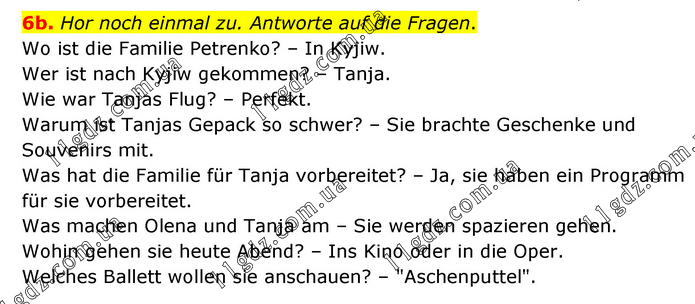 Hor noch einmal zu. Antworte auf die Fragen. Wo ist die Familie Petrenko? – In Kyjiw. Wer ist nach Kyjiw gekommen? – Tanja. Wie war Tanjas Flug? – Perfekt. Warum ist Tanjas Gepack so schwer? – Sie brachte Geschenke und Souvenirs mit. Was hat die Familie für Tanja vorbereitet? – Ja, sie haben ein Programm für sie vorbereitet. Was machen Olena und Tanja am – Sie werden spazieren gehen. Wohin gehen sie heute Abend? – Ins Kino oder in die Oper. Welches Ballett wollen sie anschauen? – "Aschenputtel".