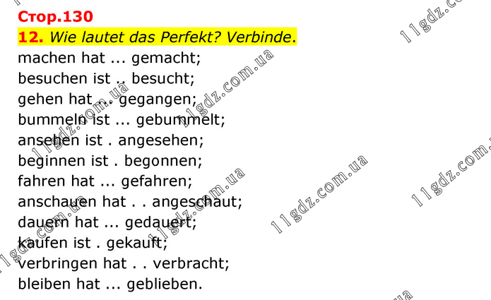 Wie lautet das Perfekt? Verbinde. machen hat ... gemacht; besuchen ist .. besucht; gehen hat ... gegangen; bummeln ist ... gebummelt; ansehen ist . angesehen; beginnen ist . begonnen; fahren hat ... gefahren; anschauen hat . . angeschaut; dauern hat ... gedauert; kaufen ist . gekauft; verbringen hat . . verbracht; bleiben hat ... geblieben.