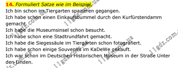 Formuliert Satze wie im Beispiel. Ich bin schon im Tiergarten spazieren gegangen. Ich habe schon einen Einkaufsbummel durch den Kurfürstendamm gemacht. Ich habe die Museumsinsel schon besucht. Ich habe schon eine Stadtrundfahrt gemacht. Ich habe die Siegessäule im Tiergarten schon fotografiert. Ich habe schon einige Souvenirs im KaDeWe gekauft. Ich war schon im Deutschen Historischen Museum in der Straße Unter den Linden.