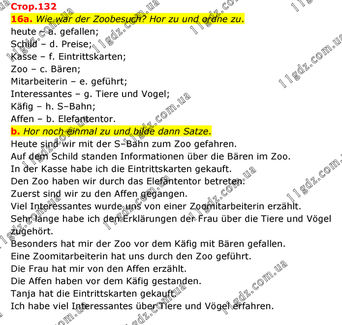 a. Wie war der Zoobesuch? Hor zu und ordne zu. heute – a. gefallen; Schild – d. Preise; Kasse – f. Eintrittskarten; Zoo – c. Bären; Mitarbeiterin – e. geführt; Interessantes – g. Tiere und Vogel; Käfig – h. S–Bahn; Affen – b. Elefantentor. b. Hor noch einmal zu und bilde dann Satze. Heute sind wir mit der S–Bahn zum Zoo gefahren. Auf dem Schild standen Informationen über die Bären im Zoo. In der Kasse habe ich die Eintrittskarten gekauft. Den Zoo haben wir durch das Elefantentor betreten. Zuerst sind wir zu den Affen gegangen. Viel Interessantes wurde uns von einer Zoomitarbeiterin erzählt. Sehr lange habe ich den Erklärungen der Frau über die Tiere und Vögel zugehört. Besonders hat mir der Zoo vor dem Käfig mit Bären gefallen. Eine Zoomitarbeiterin hat uns durch den Zoo geführt. Die Frau hat mir von den Affen erzählt. Die Affen haben vor dem Käfig gestanden. Tanja hat die Eintrittskarten gekauft. Ich habe viel Interessantes über Tiere und Vögel erfahren.