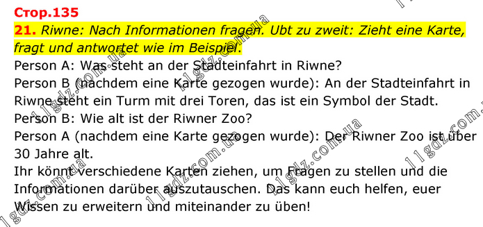 Riwne: Nach Informationen fragen. Ubt zu zweit: Zieht eine Karte, fragt und antwortet wie im Beispiel. Person A: Was steht an der Stadteinfahrt in Riwne? Person B (nachdem eine Karte gezogen wurde): An der Stadteinfahrt in Riwne steht ein Turm mit drei Toren, das ist ein Symbol der Stadt. Person B: Wie alt ist der Riwner Zoo? Person A (nachdem eine Karte gezogen wurde): Der Riwner Zoo ist über 30 Jahre alt. Ihr könnt verschiedene Karten ziehen, um Fragen zu stellen und die Informationen darüber auszutauschen. Das kann euch helfen, euer Wissen zu erweitern und miteinander zu üben!