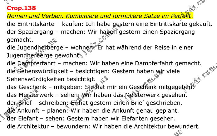 Nomen und Verben. Kombiniere und formuliere Satze im Perfekt. die Eintrittskarte – kaufen: Ich habe gestern eine Eintrittskarte gekauft. der Spaziergang – machen: Wir haben gestern einen Spaziergang gemacht. die Jugendherberge – wohnen: Er hat während der Reise in einer Jugendherberge gewohnt. die Dampferfahrt – machen: Wir haben eine Dampferfahrt gemacht. die Sehenswürdigkeit – besichtigen: Gestern haben wir viele Sehenswürdigkeiten besichtigt. das Geschenk – mitgeben: Sie hat mir ein Geschenk mitgegeben. das Meisterwerk – sehen: Wir haben das Meisterwerk gesehen. der Brief – schreiben: Er hat gestern einen Brief geschrieben. die Ankunft – planen: Wir haben die Ankunft genau geplant. der Elefant – sehen: Gestern haben wir Elefanten gesehen. die Architektur – bewundern: Wir haben die Architektur bewundert.