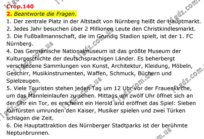 Beantworte die Fragen. 1. Der zentrale Platz in der Altstadt von Nürnberg heißt der Hauptmarkt. 2. Jedes Jahr besuchen über 2 Millionen Leute den Christkindlesmarkt. 3. Die Fußballmannschaft, die im Grundig Stadion spielt, ist der 1. FC Nürnberg. 4. Das Germanische Nationalmuseum ist das größte Museum der Kulturgeschichte der deutschsprachigen Länder. Es beherbergt verschiedene Sammlungen von Kunst, Architektur, Kleidung, Möbeln, Geschirr, Musikinstrumenten, Waffen, Schmuck, Büchern und Spielzeugen. 5. Viele Touristen stehen jeden Tag um 12 Uhr vor der Frauenkirche, um das Männleinlaufen zu sehen. Mittags um zwölf Uhr öffnet sich an der Uhr ein Tor, es erscheint ein Herold und eröffnet das Spiel: Sieben Kurfürsten umrunden den Kaiser, Musiker spielen und zwei Türken schlagen die Zeit. 6. Die Hauptattraktion des Nürnberger Stadtparks ist der berühmte Neptunbrunnen.