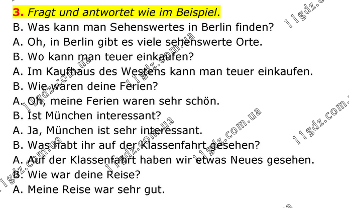 Fragt und antwortet wie im Beispiel. B. Was kann man Sehenswertes in Berlin finden? A. Oh, in Berlin gibt es viele sehenswerte Orte. B. Wo kann man teuer einkaufen? A. Im Kaufhaus des Westens kann man teuer einkaufen. B. Wie waren deine Ferien? A. Oh, meine Ferien waren sehr schön. B. Ist München interessant? A. Ja, München ist sehr interessant. B. Was habt ihr auf der Klassenfahrt gesehen? A. Auf der Klassenfahrt haben wir etwas Neues gesehen. B. Wie war deine Reise? A. Meine Reise war sehr gut.