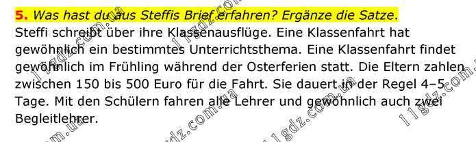 Was hast du aus Steffis Brief erfahren? Ergänze die Satze. Steffi schreibt über ihre Klassenausflüge. Eine Klassenfahrt hat gewöhnlich ein bestimmtes Unterrichtsthema. Eine Klassenfahrt findet gewöhnlich im Frühling während der Osterferien statt. Die Eltern zahlen zwischen 150 bis 500 Euro für die Fahrt. Sie dauert in der Regel 4–5 Tage. Mit den Schülern fahren alle Lehrer und gewöhnlich auch zwei Begleitlehrer.