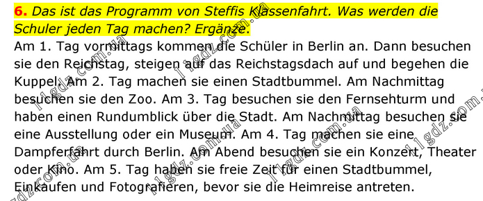 Das ist das Programm von Steffis Klassenfahrt. Was werden die Schuler jeden Tag machen? Ergänze. Am 1. Tag vormittags kommen die Schüler in Berlin an. Dann besuchen sie den Reichstag, steigen auf das Reichstagsdach auf und begehen die Kuppel. Am 2. Tag machen sie einen Stadtbummel. Am Nachmittag besuchen sie den Zoo. Am 3. Tag besuchen sie den Fernsehturm und haben einen Rundumblick über die Stadt. Am Nachmittag besuchen sie eine Ausstellung oder ein Museum. Am 4. Tag machen sie eine Dampferfahrt durch Berlin. Am Abend besuchen sie ein Konzert, Theater oder Kino. Am 5. Tag haben sie freie Zeit für einen Stadtbummel, Einkaufen und Fotografieren, bevor sie die Heimreise antreten.