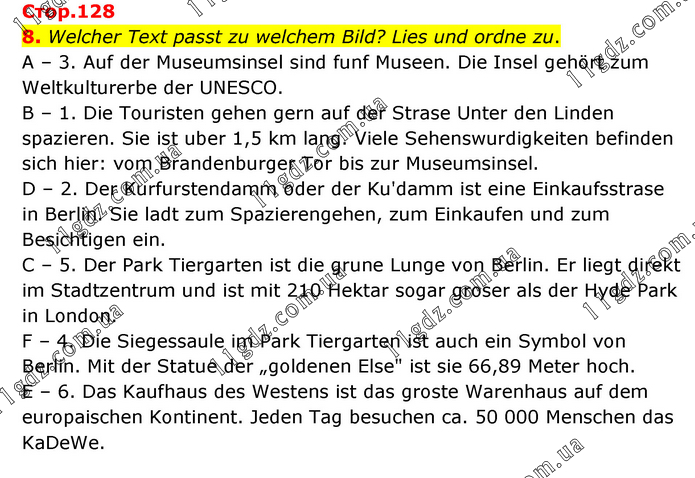 Welcher Text passt zu welchem Bild? Lies und ordne zu. A – 3. Аuf der Museumsinsel sind funf Museen. Die Insel gehört zum Weltkulturerbe der UNESCO. B – 1. Die Touristen gehen gern auf der Strase Unter den Linden spazieren. Sie ist uber 1,5 km lang. Viele Sehenswurdigkeiten befinden sich hier: vom Brandenburger Tor bis zur Museumsinsel. D – 2. Der Kurfurstendamm oder der Ku'damm ist eine Einkaufsstrase in Berlin. Sie ladt zum Spazierengehen, zum Einkaufen und zum Besichtigen ein. C – 5. Der Park Tiergarten ist die grune Lunge von Berlin. Er liegt direkt im Stadtzentrum und ist mit 210 Hektar sogar groser als der Hyde Park in London. F – 4. Die Siegessaule im Park Tiergarten ist auch ein Symbol von Berlin. Mit der Statue der „goldenen Else" ist sie 66,89 Meter hoch. E – 6. Das Kaufhaus des Westens ist das groste Warenhaus auf dem europaischen Kontinent. Jeden Tag besuchen ca. 50 000 Menschen das KaDeWe.