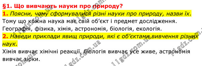 §1. Що вивчають науки про природу? 1. Поясни, чому сформувалися різні науки про природу, назви їх. Тому що кожна наука має свій об’єкт і предмет дослідження. Географія, фізика, хімія, астрономія, біологія, екологія. 2. Наведи приклади явищ природи, які є об’єктами вивчення різних наук. Хімія вивчає хімічні реакції, біологія вивчає усе живе, астрономія вивчає зірки.