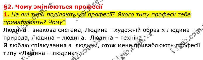 §2. Чому змінюються професії 1. На які типи поділяють усі професії? Якого типу професії тебе приваблюють? Чому? Людина - знакова система, Людина - художній образ х Людина – природа, Людина – людина, Людина – техніка. Я люблю спілкування з людьми, отож мене приваблюють професії типу «Людина – людина».