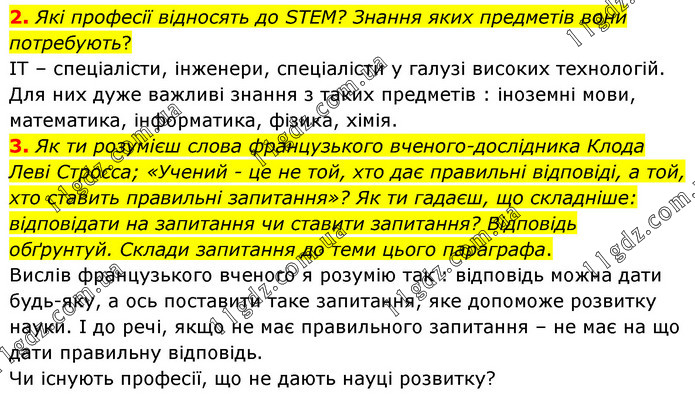 2. Які професії відносять до SТЕМ? Знання яких предметів вони потребують? ІТ – спеціалісти, інженери, спеціалісти у галузі високих технологій. Для них дуже важливі знання з таких предметів : іноземні мови, математика, інформатика, фізика, хімія. 3. Як ти розумієш слова французького вченого-дослідника Клода Леві Стросса; «Учений - це не той, хто дає правильні відповіді, а той, хто ставить правильні запитання»? Як ти гадаєш, що складніше: відповідати на запитання чи ставити запитання? Відповідь обґрунтуй. Склади запитання до теми цього параграфа. Вислів французького вченого я розумію так : відповідь можна дати будь-яку, а ось поставити таке запитання, яке допоможе розвитку науки. І до речі, якщо не має правильного запитання – не має на що дати правильну відповідь. Чи існують професії, що не дають науці розвитку?