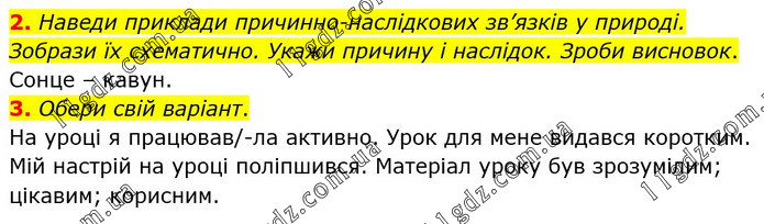 2. Наведи приклади причинно-наслідкових зв’язків у природі. Зобрази їх схематично. Укажи причину і наслідок. Зроби висновок. Сонце – кавун. 3. Обери свій варіант. На уроці я працював/-ла активно. Урок для мене видався коротким. Мій настрій на уроці поліпшився. Матеріал уроку був зрозумілим; цікавим; корисним.
