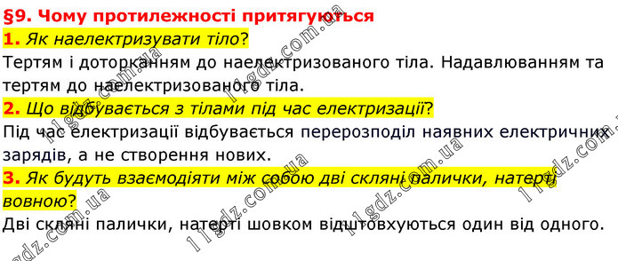 §9. Чому протилежності притягуються 1. Як наелектризувати тіло? Тертям і доторканням до наелектризованого тіла. Надавлюванням та тертям до наелектризованого тіла. 2. Що відбувається з тілами під час електризації? Під час електризації відбувається перерозподіл наявних електричних зарядів, а не створення нових. 3. Як будуть взаємодіяти між собою дві скляні палички, натерті вовною? Дві скляні палички, натерті шовком відштовхуються один від одного.