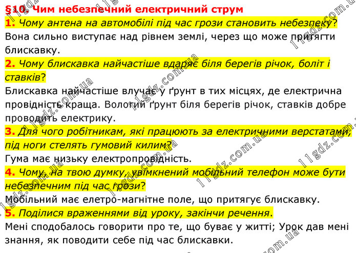 §10. Чим небезпечний електричний струм 1. Чому антена на автомобілі під час грози становить небезпеку? Вона сильно виступає над рівнем землі, через що може притягти блискавку. 2. Чому блискавка найчастіше вдаряє біля берегів річок, боліт і ставків? Блискавка найчастіше влучає у ґрунт в тих місцях, де електрична провідність краща. Вологий ґрунт біля берегів річок, ставків добре проводить електрику. 3. Для чого робітникам, які працюють за електричними верстатами, під ноги стелять гумовий килим? Гума має низьку електропровідність. 4. Чому, на твою думку, увімкнений мобільний телефон може бути небезпечним під час грози? Мобільний має елетро-магнітне поле, що притягує блискавку. 5. Поділися враженнями від уроку, закінчи речення. Мені сподобалось говорити про те, що буває у житті; Урок дав мені знання, як поводити себе під час блискавки.