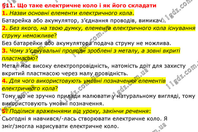 §11. Що таке електричне коло і як його складати 1. Назви основні елементи електричного кола. Батарейка або акумулятор, з’єднання проводів, вимикач. 2. Без якого, на твою думку, елемента електричного кола існування струму неможливе? Без батарейки або акумулятора подача струму не можлива. 3. Чому з’єднувальні проводи зроблені з металу, а зовні вкриті пластмасою? Метал має високу електропровідність, натомість дріт для захисту вкритий пластмасою через малу провідність. 4. Для чого використовують умовні позначення елементів електричного кола? Тому що не зручно прилади малювати у натуральному вигляді, тому використовують умовні позначення. 5. Поділися враженнями від уроку, закінчи речення: Сьогодні я навчився/-лась створювати електричне коло. Я зміг/змогла нарисувати електричне коло.