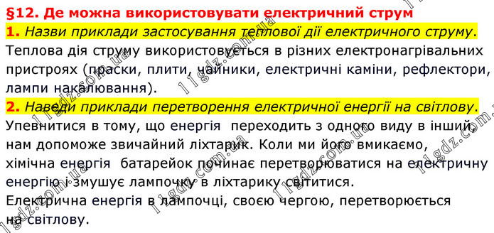 §12. Де можна використовувати електричний струм 1. Назви приклади застосування теплової дії електричного струму. Теплова дія струму використовується в різних електронагрівальних пристроях (праски, плити, чайники, електричні каміни, рефлектори, лампи накалювання). 2. Наведи приклади перетворення електричної енергії на світлову. Упевнитися в тому, що енергія переходить з одного виду в інший, нам допоможе звичайний ліхтарик. Коли ми його вмикаємо, хімічна енергія батарейок починає перетворюватися на електричну енергію і змушує лампочку в ліхтарику світитися. Електрична енергія в лампочці, своєю чергою, перетворюється на світлову.
