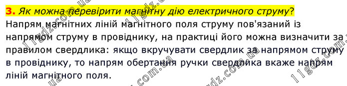 3. Як можна перевірити магнітну дію електричного струму? Напрям магнітних ліній магнітного поля струму пов'язаний із напрямом струму в провіднику, на практиці його можна визначити за правилом свердлика: якщо вкручувати свердлик за напрямом струму в провіднику, то напрям обертання ручки свердлика вкаже напрям ліній магнітного поля.