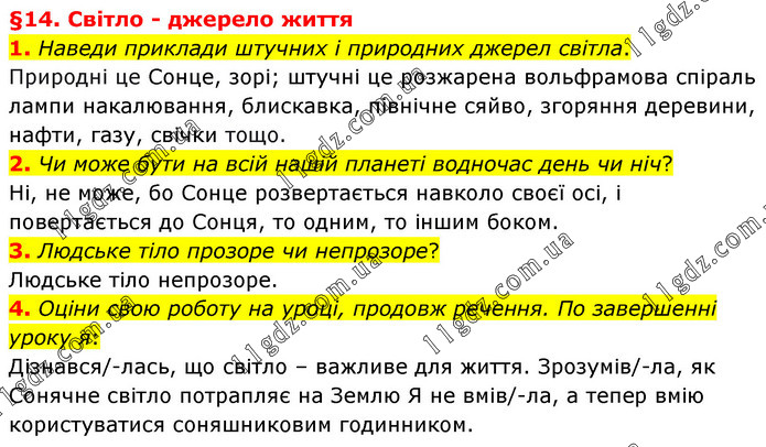 §14. Світло - джерело життя 1. Наведи приклади штучних і природних джерел світла. Природні це Сонце, зорі; штучні це розжарена вольфрамова спіраль лампи накалювання, блискавка, північне сяйво, згоряння деревини, нафти, газу, свічки тощо. 2. Чи може бути на всій нашій планеті водночас день чи ніч? Ні, не може, бо Сонце розвертається навколо своєї осі, і повертається до Сонця, то одним, то іншим боком. 3. Людське тіло прозоре чи непрозоре? Людське тіло непрозоре. 4. Оціни свою роботу на уроці, продовж речення. По завершенні уроку я: Дізнався/-лась, що світло – важливе для життя. Зрозумів/-ла, як Сонячне світло потрапляє на Землю Я не вмів/-ла, а тепер вмію користуватися соняшниковим годинником.
