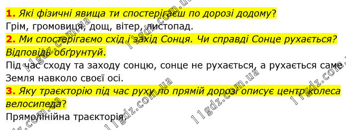1. Які фізичні явища ти спостерігаєш по дорозі додому? Грім, громовиця, дощ, вітер, листопад. 2. Ми спостерігаємо схід і захід Сонця. Чи справді Сонце рухається? Відповідь обґрунтуй. Під час сходу та заходу сонцю, сонце не рухається, а рухається саме Земля навколо своєї осі. 3. Яку траєкторію під час руху по прямій дорозі описує центр колеса велосипеда? Прямолінійна траєкторія.