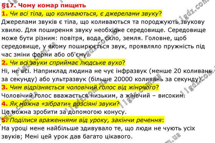 §17. Чому комар пищить 1. Чи всі тіла, що коливаються, є джерелами звуку? Джерелами звуків є тіла, що коливаються та породжують звукову хвилю. Для поширення звуку необхідне середовище. Середовище може бути різним: повітря, вода, скло, земля. Головне, щоб середовище, у якому поширюється звук, проявляло пружність під час зміни форми або об'єму. 2. Чи всі звуки сприймає людське вухо? Ні, не всі. Наприклад людина не чує інфразвук (менше 20 коливань за секунду) або ультразвук (більше 20000 коливань за секунду). 3. Чим відрізняється чоловічий голос від жіночого? Чоловічий голос вважається низьким, а жіночий – високим. 4. Як можна «зібрати» розсіяні звуки? Це можна зробити за допомогою конусу. 5. Поділися враженнями від уроку, закінчи речення: На уроці мене найбільше здивувало те, що люди не чують усіх звуків; Мені цей урок дав багато цікавого.
