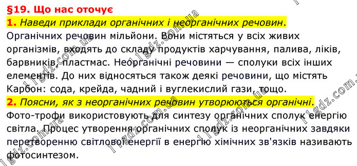 §19. Що нас оточує 1. Наведи приклади органічних і неорганічних речовин. Органічних речовин мільйони. Вони містяться у всіх живих організмів, входять до складу продуктів харчування, палива, ліків, барвників, пластмас. Неорганічні речовини — сполуки всіх інших елементів. До них відносяться також деякі речовини, що містять Карбон: сода, крейда, чадний і вуглекислий гази, тощо. 2. Поясни, як з неорганічних речовин утворюються органічні. Фото-трофи використовують для синтезу органічних сполук енергію світла. Процес утворення органічних сполук із неорганічних завдяки перетворенню світлової енергії в енергію хімічних зв'язків називають фотосинтезом.