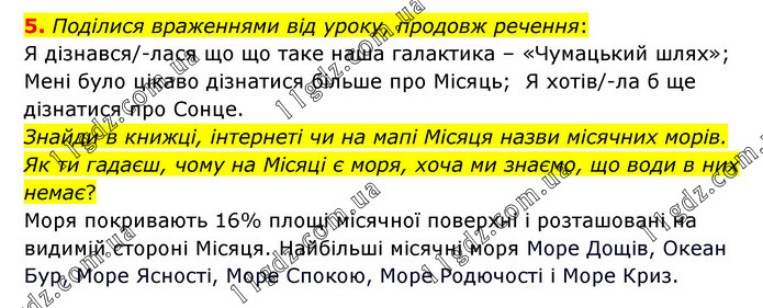 5. Поділися враженнями від уроку, продовж речення: Я дізнався/-лася що що таке наша галактика – «Чумацький шлях»; Мені було цікаво дізнатися більше про Місяць; Я хотів/-ла б ще дізнатися про Сонце. Знайди в книжці, інтернеті чи на мапі Місяця назви місячних морів. Як ти гадаєш, чому на Місяці є моря, хоча ми знаємо, що води в них немає? Моря покривають 16% площі місячної поверхні і розташовані на видимій стороні Місяця. Найбільші місячні моря Море Дощів, Океан Бур, Море Ясності, Море Спокою, Море Родючості і Море Криз.