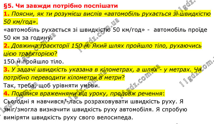 §5. Чи завжди потрібно поспішати 1. Поясни, як ти розумієш вислів «автомобіль рухається зі швидкістю 50 км/год». «автомобіль рухається зі швидкістю 50 км/год» - автомобіль проїде 50 км за годину. 2. Довжина траєкторії 150 м. Який шлях пройшло тіло, рухаючись цією траєкторією? 150 м пройшло тіло. 3. У задачі швидкість указана в кілометрах, а шлях - у метрах. Чи потрібно переводити кілометри в метри? Так, треба, щоб урівняти умови. 4. Поділися враженнями від уроку, продовж речення: Сьогодні я навчився/-лась розраховувати швидкість руху. Я зміг/змогла визначити швидкість руху автомобіля. Я спробую виміряти швидкість руху свого велосипеда.