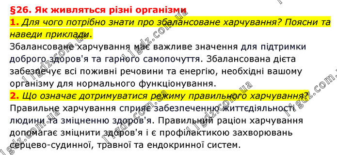 §26. Як живляться різні організми 1. Для чого потрібно знати про збалансоване харчування? Поясни та наведи приклади. Збалансоване харчування має важливе значення для підтримки доброго здоров'я та гарного самопочуття. Збалансована дієта забезпечує всі поживні речовини та енергію, необхідні вашому організму для нормального функціонування. 2. Що означає дотримуватися режиму правильного харчування? Правильне харчування сприяє забезпеченню життєдіяльності людини та зміцненню здоров'я. Правильний раціон харчування допомагає зміцнити здоров'я і є профілактикою захворювань серцево-судинної, травної та ендокринної систем.
