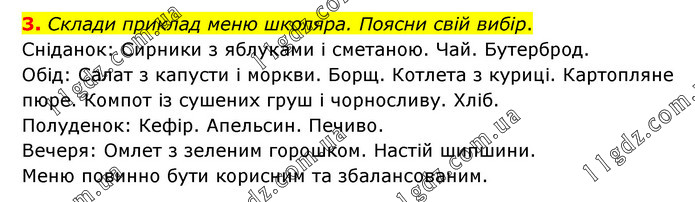 Склади приклад меню школяра. Поясни свій вибір. Сніданок: Сирники з яблуками і сметаною. Чай. Бутерброд. Обід: Салат з капусти і моркви. Борщ. Котлета з куриці. Картопляне пюре. Компот із сушених груш і чорносливу. Хліб. Полуденок: Кефір. Апельсин. Печиво. Вечеря: Омлет з зеленим горошком. Настій шипшини. Меню повинно бути корисним та збалансованим.